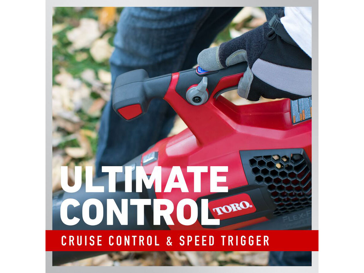 The Toro 60V Max Brushless Leaf Blower is an aerodynamic beast, thanks to PowerJet® technology. Larger air vents maximize air intake, while the perfectly optimized jet fan design provides peak efficiency, resulting in supercharged airflow. Go from zero to 110 mph in 1.3 seconds flat with over 565 CFM** of awesome air volume that makes small work of huge leaf piles. Achieve ultimate comfort and control with variable speed trigger, cruise control, and turbo boost button. Brushless motor with RunSmart® onboard intel optimizes RPMs and torque in real time, for peak cutting performance in the toughest conditions. As part of the Toro 60V Flex-Force Power System®, it's got power like no other that commands a full line of tools. Go from tool to tool to tool, done and done and done.